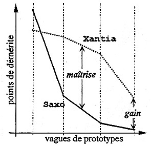 Évolution des estimations de la (non-) qualité : résultats des "démérites" des différents prototypes sur les projets Xantia (sans structure projet).
