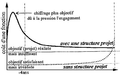 Évolution de l'estimation du coût d'une fonction au cours du développement avec et sans structure projet.