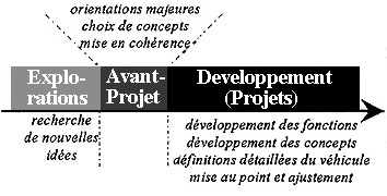 Le processus de conception initiale est constitué de plusieurs phases. En effet, les projets et le développement, qui sont le plus souvent abordés par la littérature, n'en constituent qu'une partie. Une modélisation du processus actuel permet de le décomposer en trois phases majeures, comme l'a fait C. Midler pour la Twingo (1993) :