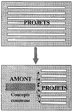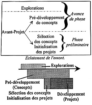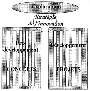 Il paraît logique, afin d'assurer la maîtrise et le succès du pré-développement des concepts, de généraliser le principe de la gestion de projet aux concepts : on s'oriente ainsi vers une "concourance généralisée" à l'amont, à travers les concepts en pré-développement, comme précédemment à travers les projets en développement (Ciavaldini, 1996). L'expérience menée à la Direction de la Recherche et des Affaires Scientifiques de PSA montrait que ce fonctionnement rigoureux est adaptable à ces activités très en amont.