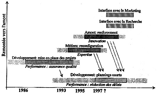 Jusqu'à aujourd'hui, trois phases majeures apparaissent, faisant suite à la rationalisation de la fabrication : tout d'abord, une rationalisation du développement, avec l'instauration des projets, pour maîtriser le processus, les objectifs et surtout la qualité ; ensuite, une reconfiguration des Métiers pour maîtriser l'expertise inter-projet ; enfin, une rationalisation et un renforcement de l'amont, avec l'organisation par concepts, pour maîtriser l'innovation.