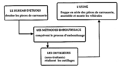 Si le projet Twingo (1989-1993) a beaucoup innové sur le plan de son organisation globale (Midler, 1993), il n'a pas transformé l'organisation de l'emboutissage. Ce métier est encore représentatif de l'organisation traditionnelle, marquée par la parcellisation, l'isolement et la séquentialité des interventions. Les métiers (design, études, méthodes, achats, fabrication ), organisés en fortes hiérarchies fonctionnelles (Larson et Gobeli, 1985) interviennent successivement, comme dans une course de relais. (V. Giard et alii, 1993, p. 108).