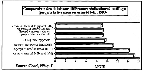 Les premières recherches de Clark et Fujimoto (1991, p. 73) et de Womack et alii (1992, p. 110) ont souligné les enjeux de la transformation des processus de développement occidentaux. Il faut, dans la seconde moitié des années 1980, environ 60 mois chez Renault pour développer un projet automobile, c'est-à-dire concevoir et industrialiser un nouveau modèle. L'objectif est de réduire ce délai à 45 mois pour les projets futurs. La tendance en emboutissage est alors cohérente avec les données générales sur les projets automobiles.
