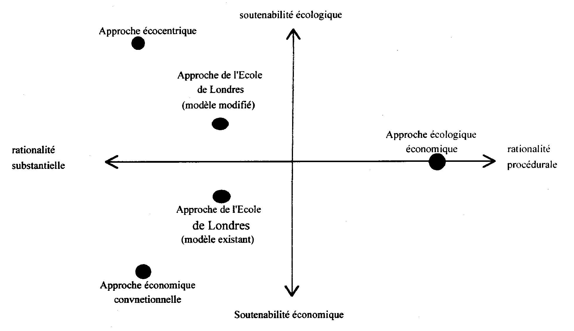 Faucheux, Groger et Noël (1993) 11 proposent une grille de lecture des approches du développement soutenable (figure 1). Cette grille se construit autour de deux axes. L'axe vertical renvoie aux critères de soutenabilité. L'axe horizontal représente la nature de la rationalité. Elle présente notamment les quatre approches ou conceptions du développement soutenable identifiées par Hatem (1990) 12 , proches de celles observées par Turner (1987) :