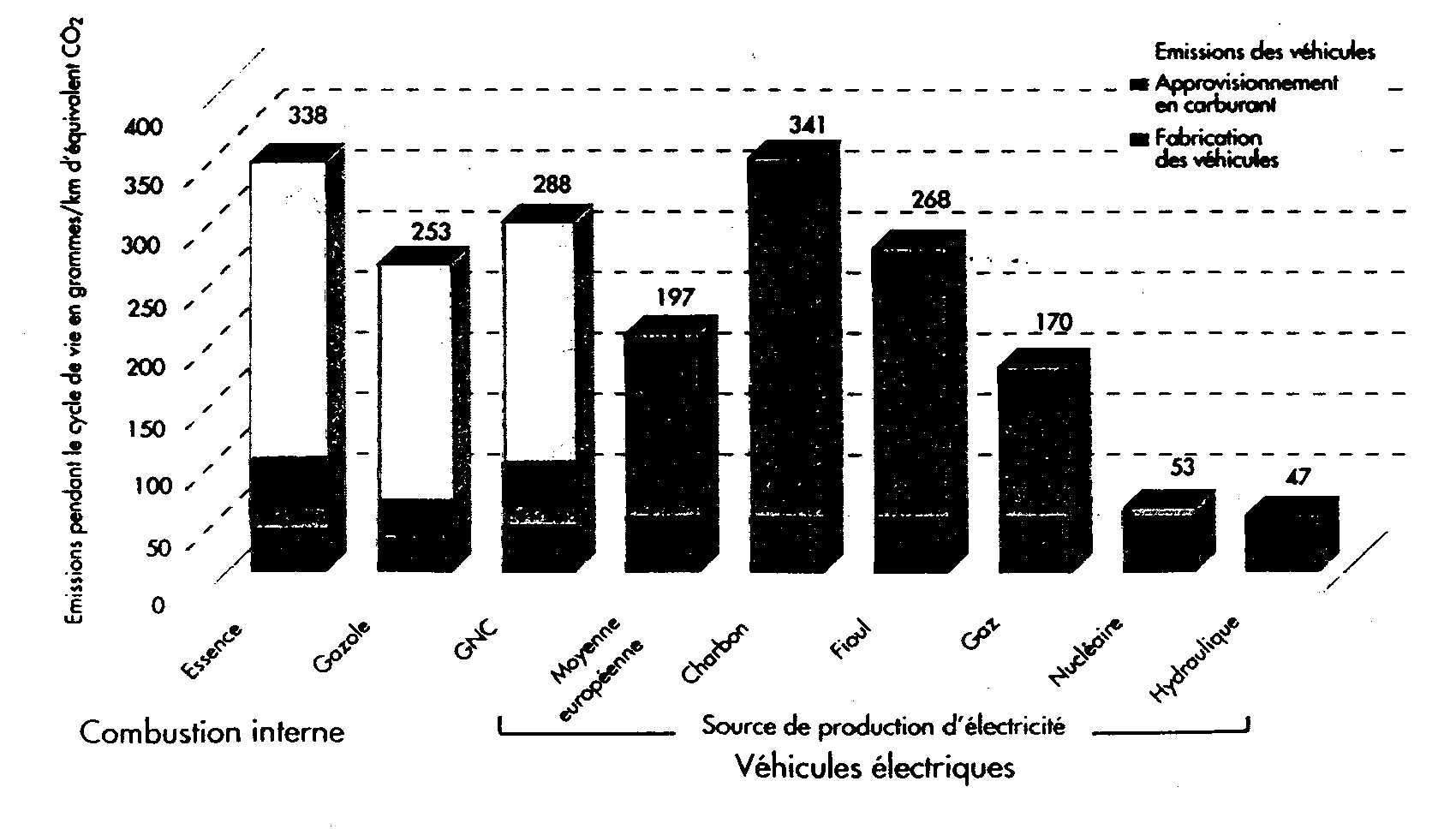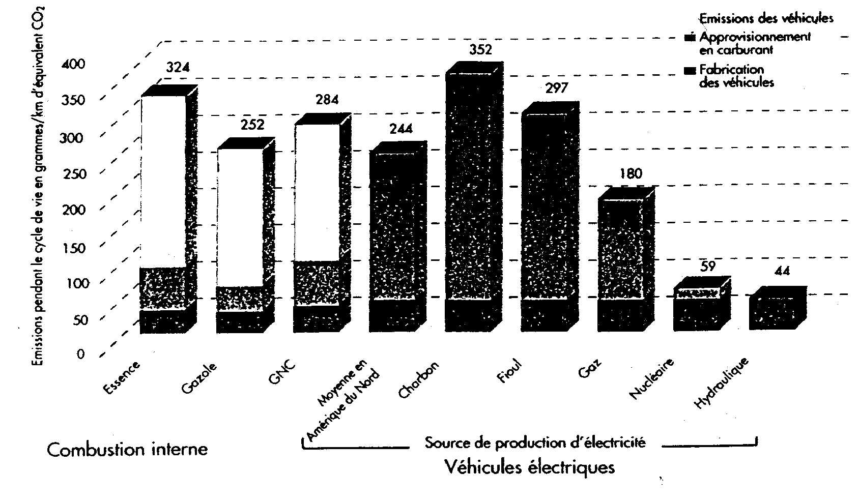 L'AIE (1994) 21 aborde également sous différents angles le véhicule électrique. Limpact environnemental du véhicule électrique à une échelle internationale est présenté. Les conclusions de lAIE quant à lutilisation des véhicules électriques comme moyen de lutte contre la pollution atmosphérique sont relatives au type démission et au mode de production de lélectricité. Ainsi, quel que soit le pays de référence, lutilisation de véhicules électriques supprimera les émissions de HC (hydrocarbures imbrûlés) et de CO (monoxyde de carbone). Pour ce qui concerne les NOx (Oxydes dazote), la quantité démissions produites dépend du combustible utilisé dans les centrales et de leurs normes démission 22.