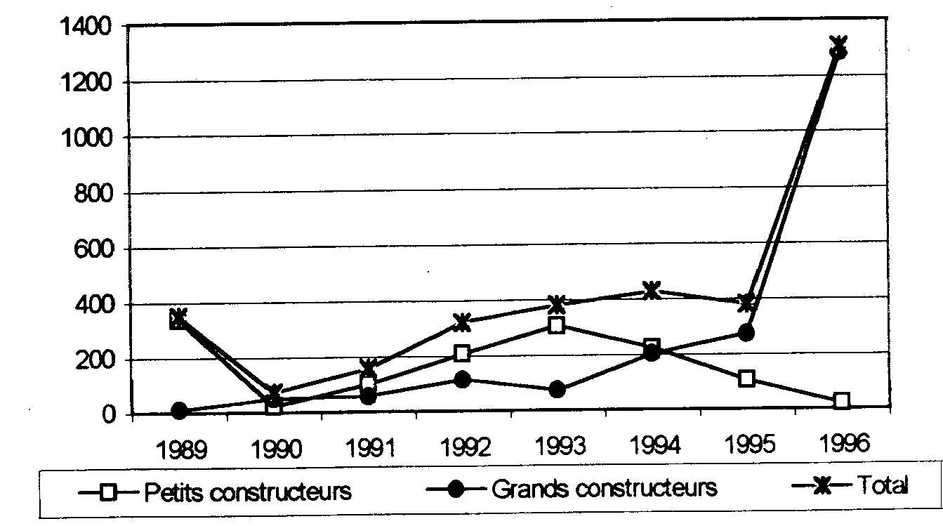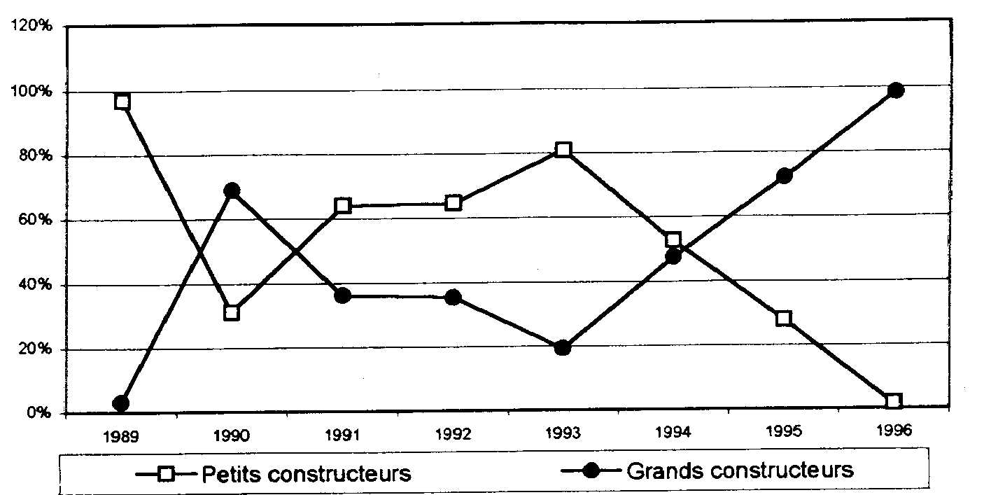 Lévolution de ce marché semble correspondre à lidée du développement dun marché pour un nouveau produit. Comme le montre le graphique suivant, le rôle des petits constructeurs a été très important, avant dêtre dépassé par celui des trois constructeurs.