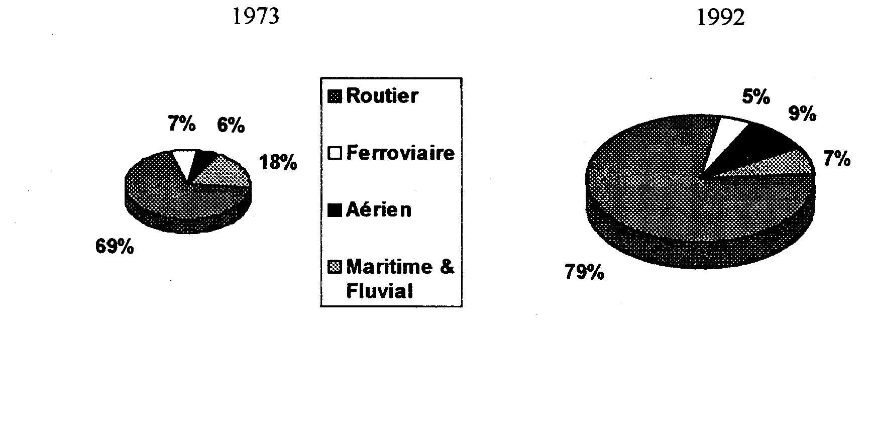 Cet accroissement a pour principale origine le développement des transports routiers qui s'effectue au détriment du transport maritime et ferroviaire. Nous trouvons ainsi pour la France 17 une part du transport routier qui passe de 32,4 millions de Tep en 1973 à 48 millions en 1992, soit une augmentation de plus de 50 % (cf.figure 3).