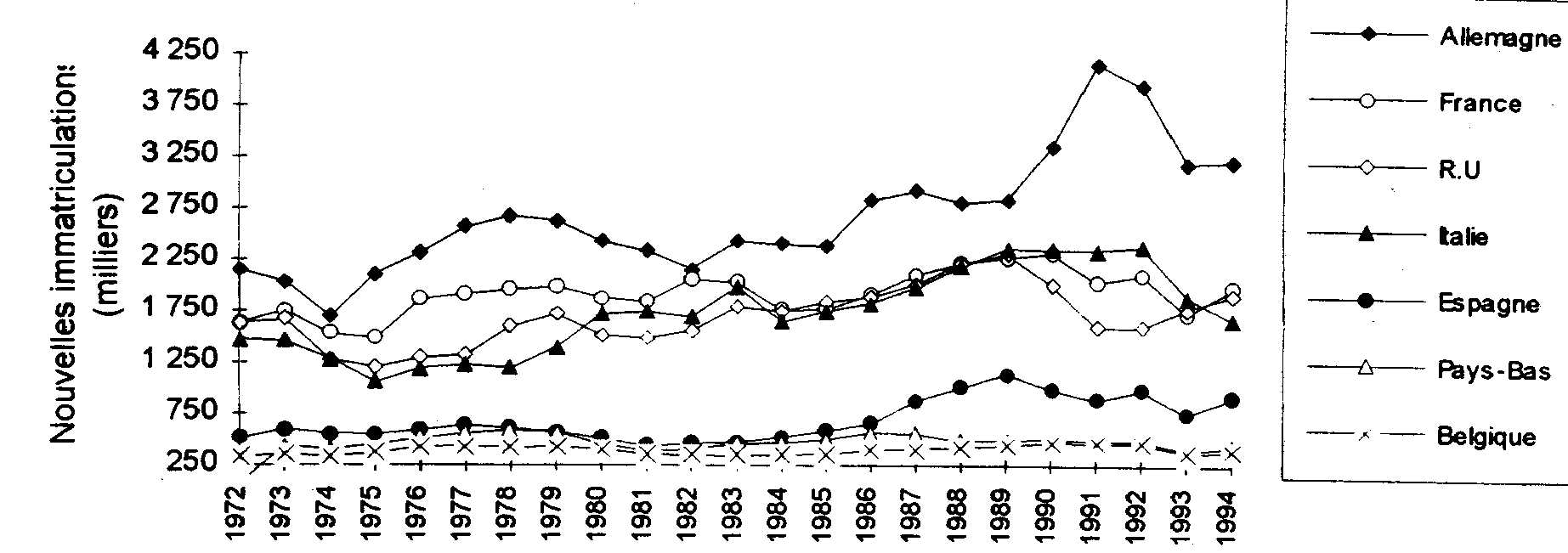 Les nouvelles immatriculations européennes dépassent celles des Etats-Unis dès 1986. Cette année correspond en effet à une augmentation importante des nouvelles immatriculations pour l'Allemagne, la France, lItalie et le Royaume-Uni.