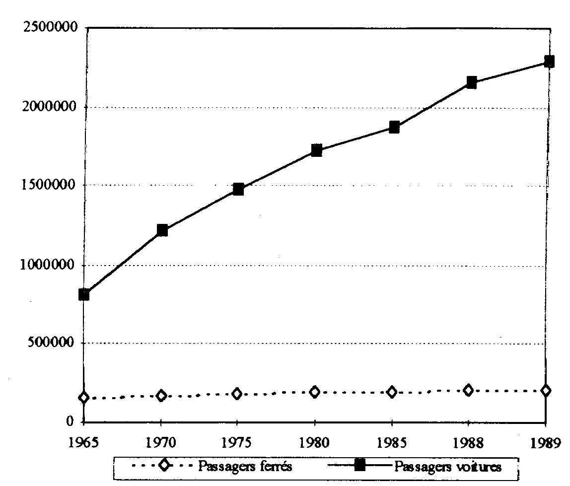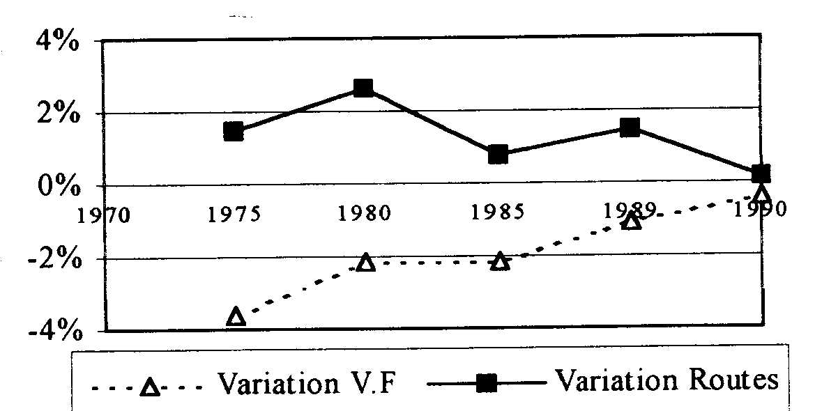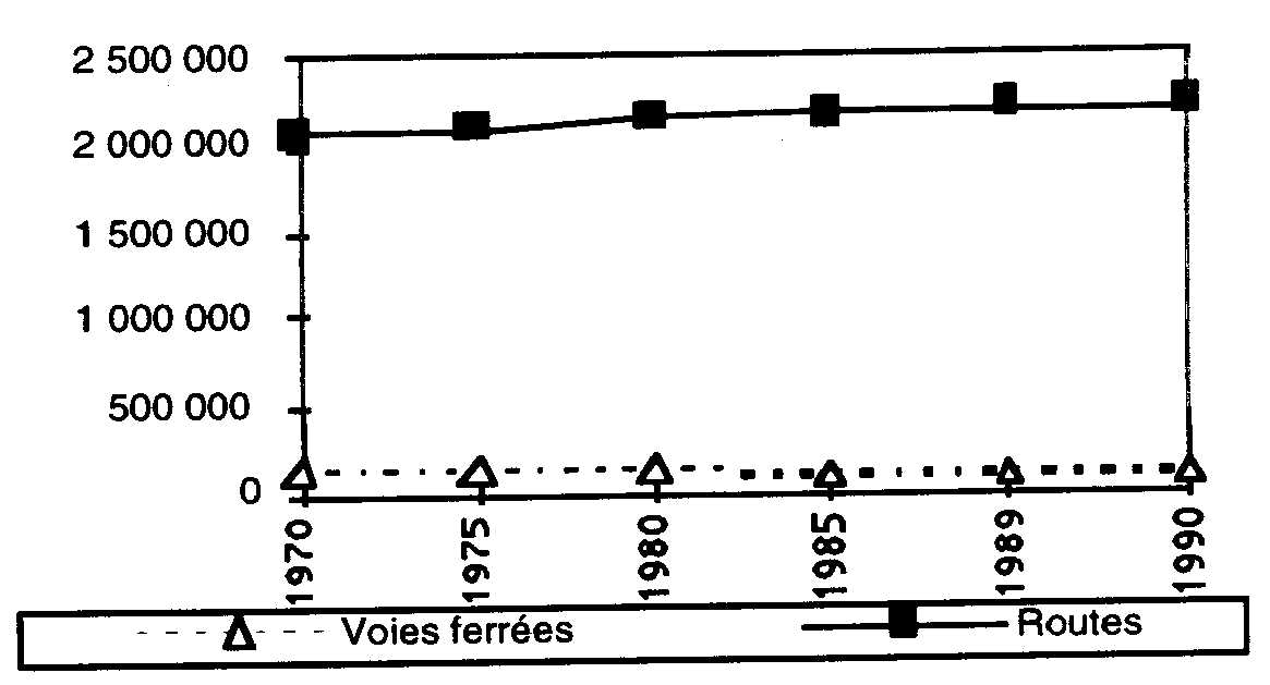 La longueur du réseau routier s'est accru de 6% sur la période 1970-1990 alors qu'il diminuait de 10% pour les réseaux ferrés. Cette augmentation de 6% équivaut à 121% du réseau ferré total de ces cinq pays. L'hypothèse que l'accroissement d'un type d'infrastructure influe sur l'usage des moyens de transport se trouve en partie vérifiée si nous prêtons l'attention à l'évolution du nombre de kilomètres/passagers pour ces cinq pays telle qu'elle est présentée sur la figure suivante.