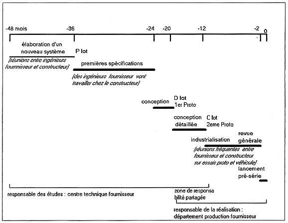 - (-24 mois) le concept est figé et commence réellement le processus de conception ; certains fournisseurs de JC sont associés. - (-20 mois) D lot : cette réunion a pour but de décider de la fabrication ou de l'abandon du projet ; fourniture du premier prototype ; les fournisseurs de JC sont associés à la conception.. - (-12 mois) C lot ; fourniture du deuxième prototype qui est testé sur le véhicule prototype. - (-2 mois) revue générale : cette réunion de synthèse a pour objectif de faire le bilan avant le lancement des pré-séries. N.B. : Par ailleurs des réunions programmées ou spontanées ont lieu pratiquemment tous les jours pour les divers ajustements nécessaires. Elles sont complétées par des échanges quotidiens inter-personnels en fonction des besoins des uns et des autres, y compris avec les ingénieurs du constructeur |