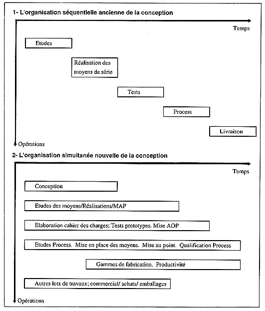 C'est donc sur la capacité à mettre plus rapidement sur le marché de nouveaux modèles attractifs que s'établit, au cours des années 80, les véritables enjeux de la compétitivité. Ceci entraîne une diminution de la durée de vie des modèles et impose une réduction des temps de conception de produits devenant plus complexes et incorporant des variantes toujours plus nombreuses. Pour faire face à ces nouvelles contraintes les entreprises mettent en oeuvre, plus ou moins rapidement et plus ou moins facilement, des méthodes de conception qualifiées d'ingénierie simultanée, d'ingénierie concourante...