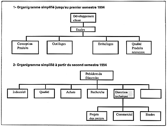 Pour tenir compte de la double nature de la conception, le département d'ingénierie (cf. encadré 1 ci-avant) est divisé en services par constructeurs auxquels s'ajoute le groupe de développement pro-actif. Chacun de ces services est composé de plusieurs équipes par spécialités technologiques ou types de pièces. Ce sont ces équipes qui forment des groupes projet/conception. Les responsables de projet sont toujours des chefs de département. Un chef de département suit tous les projets qui concernent son département. La légitimité des hommes-projet par rapport à la structure hiérarchique ne se pose donc pas puisque les deux se confondent. La coordination horizontale et la coopération d'acteurs professionnels différents est assurée par la structure elle-même qui est à la fois verticale (hiérarchie) et horizontale (regroupement de professionnalités différentes) et surtout par les procédures de participation et les nombreuses réunions qui ont lieu.